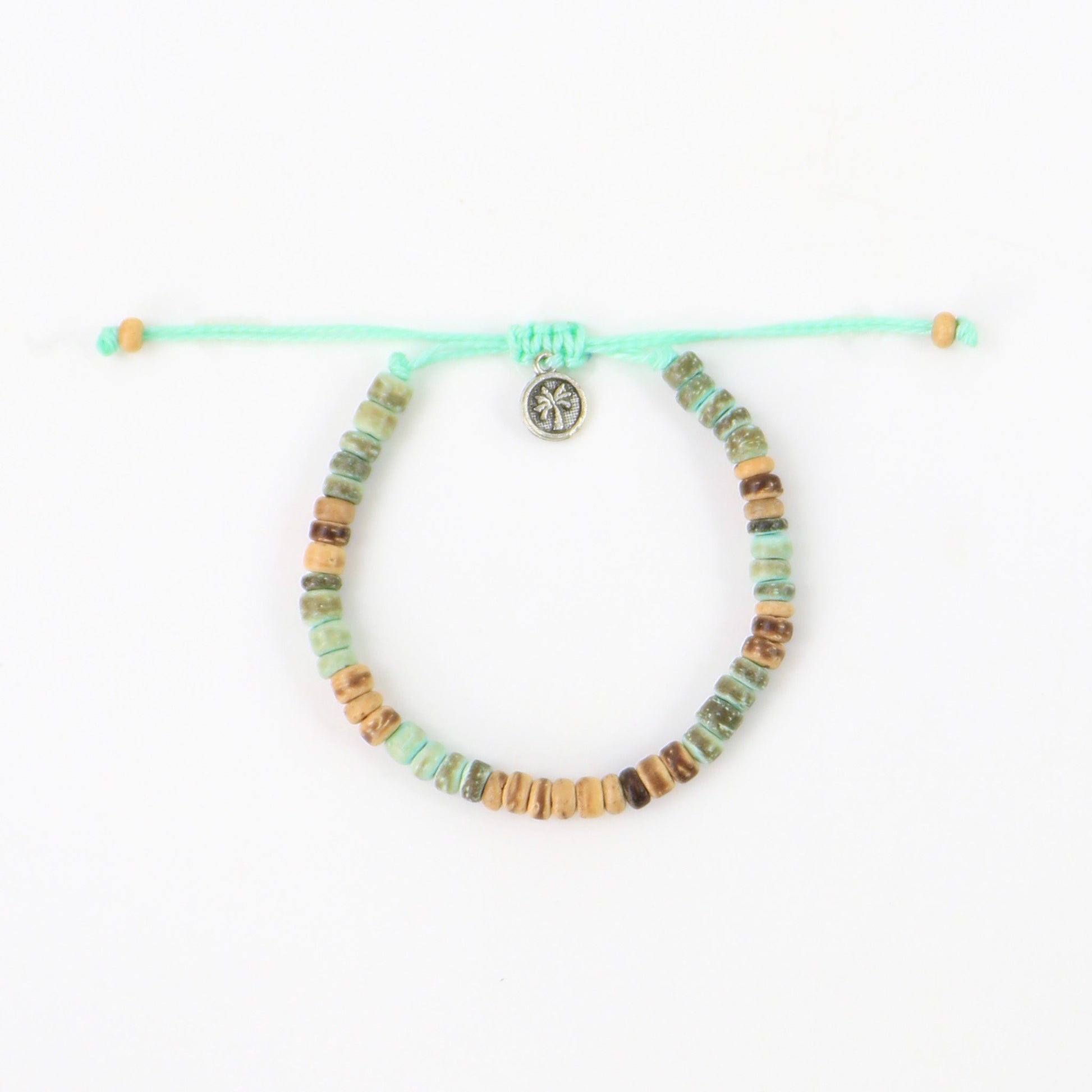 - Made with coloured coconut wood beads strung on a wax polyester cord.