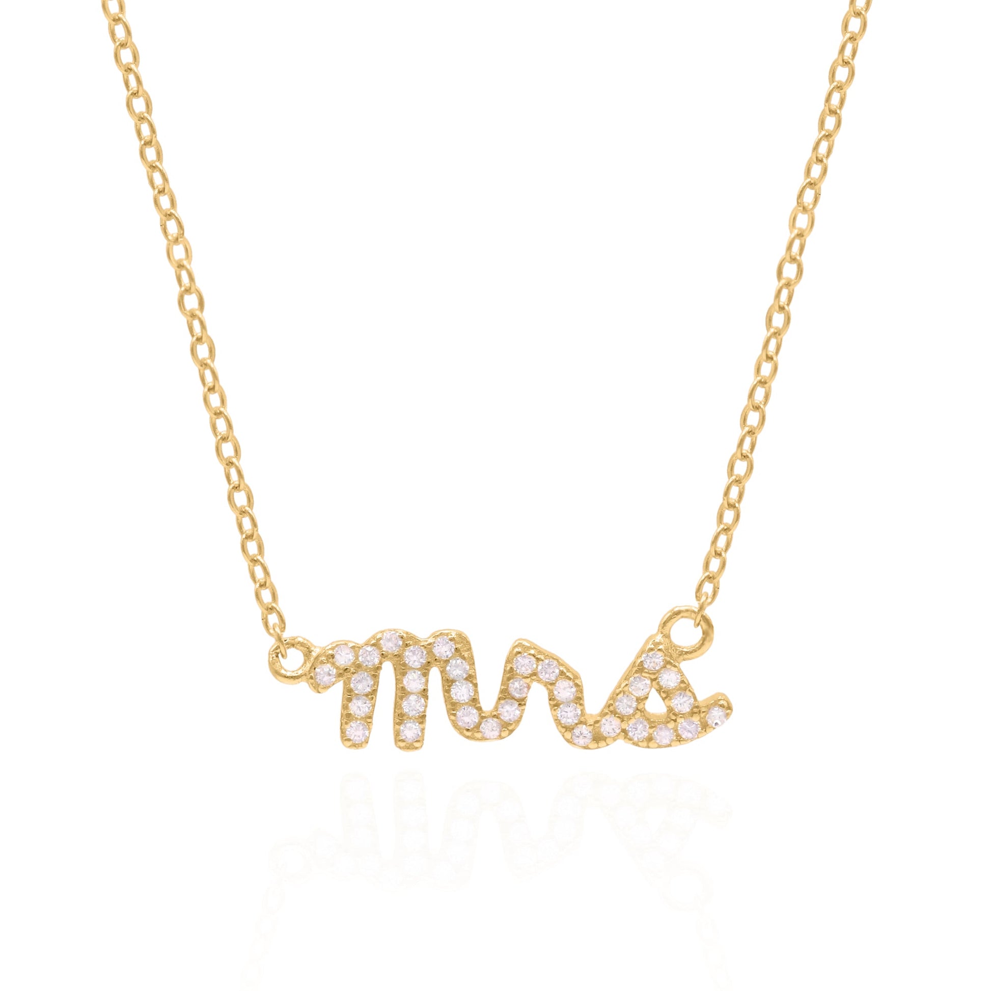The lovely Leia Mrs Necklace is the perfect understated, yet fun, style for the bride. Crafted in Gold Plated 925 Sterling Silver with sparkling pave crystals creating the shape of the word 'mrs'.