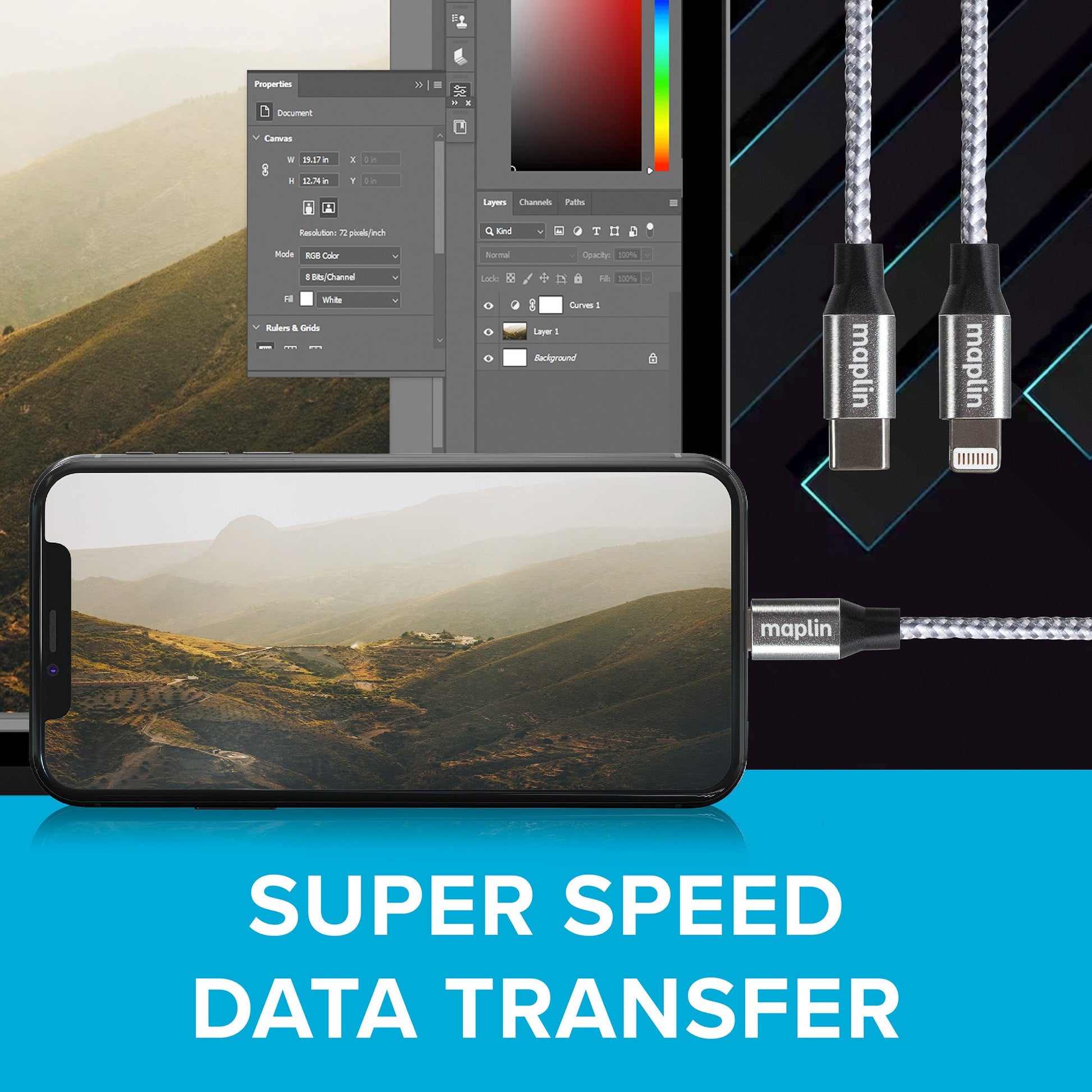 Maplin Lightning to USB-C 20W High Speed Braided Cable - Silver, 3m