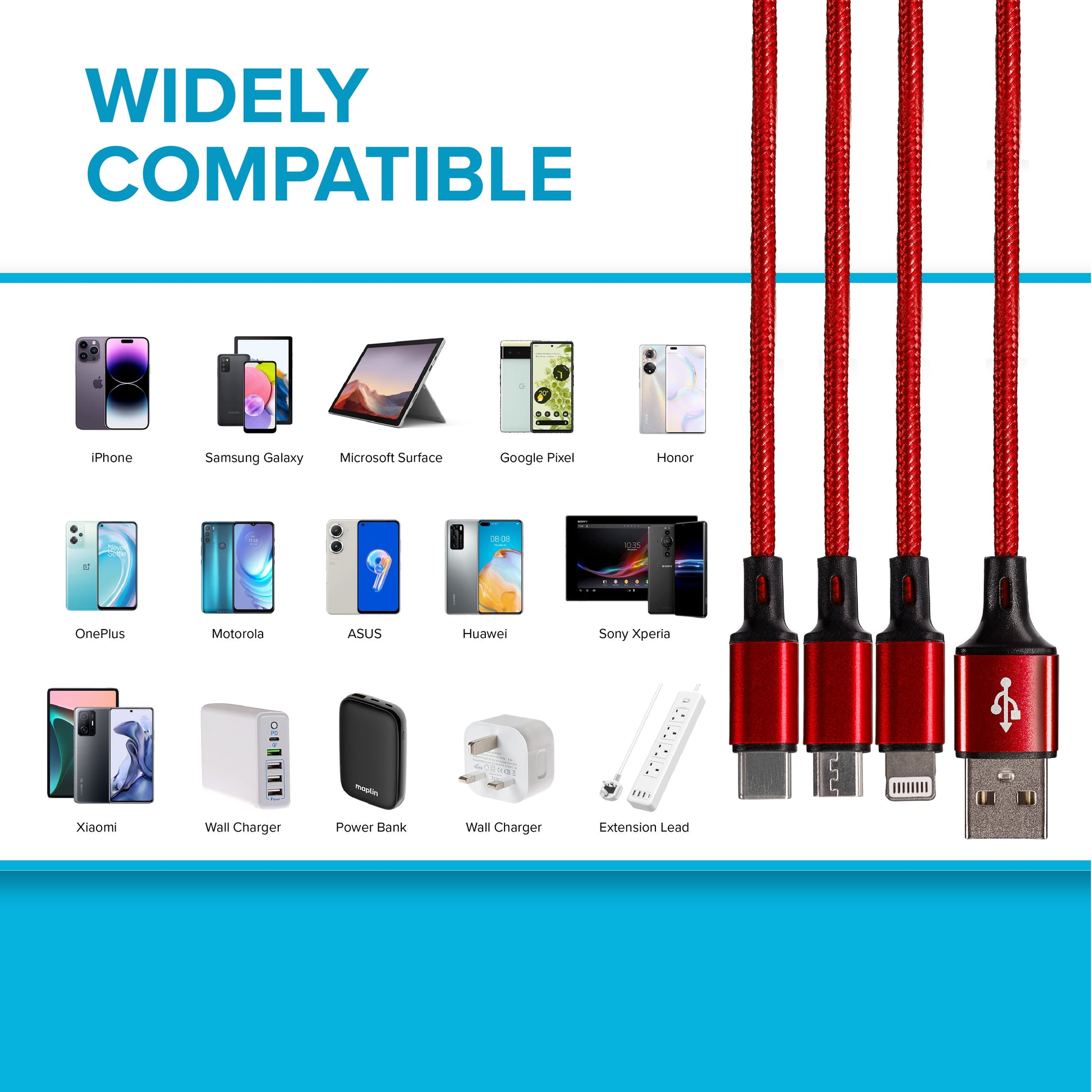 Maplin USB-A to 3-in-1 Multi-Charging USB-C / Lightning / Micro USB Braided Cable - 1.2m