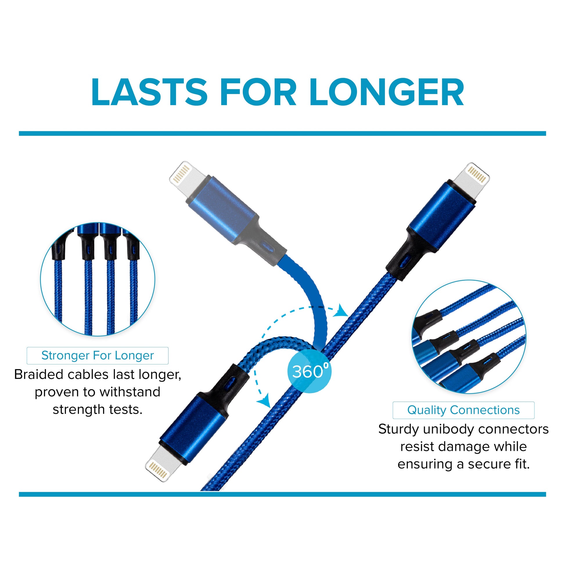 The cable has a fabric braided tangle free outer cover to ensure both durability and flexibility. Designed for long-lasting quality.