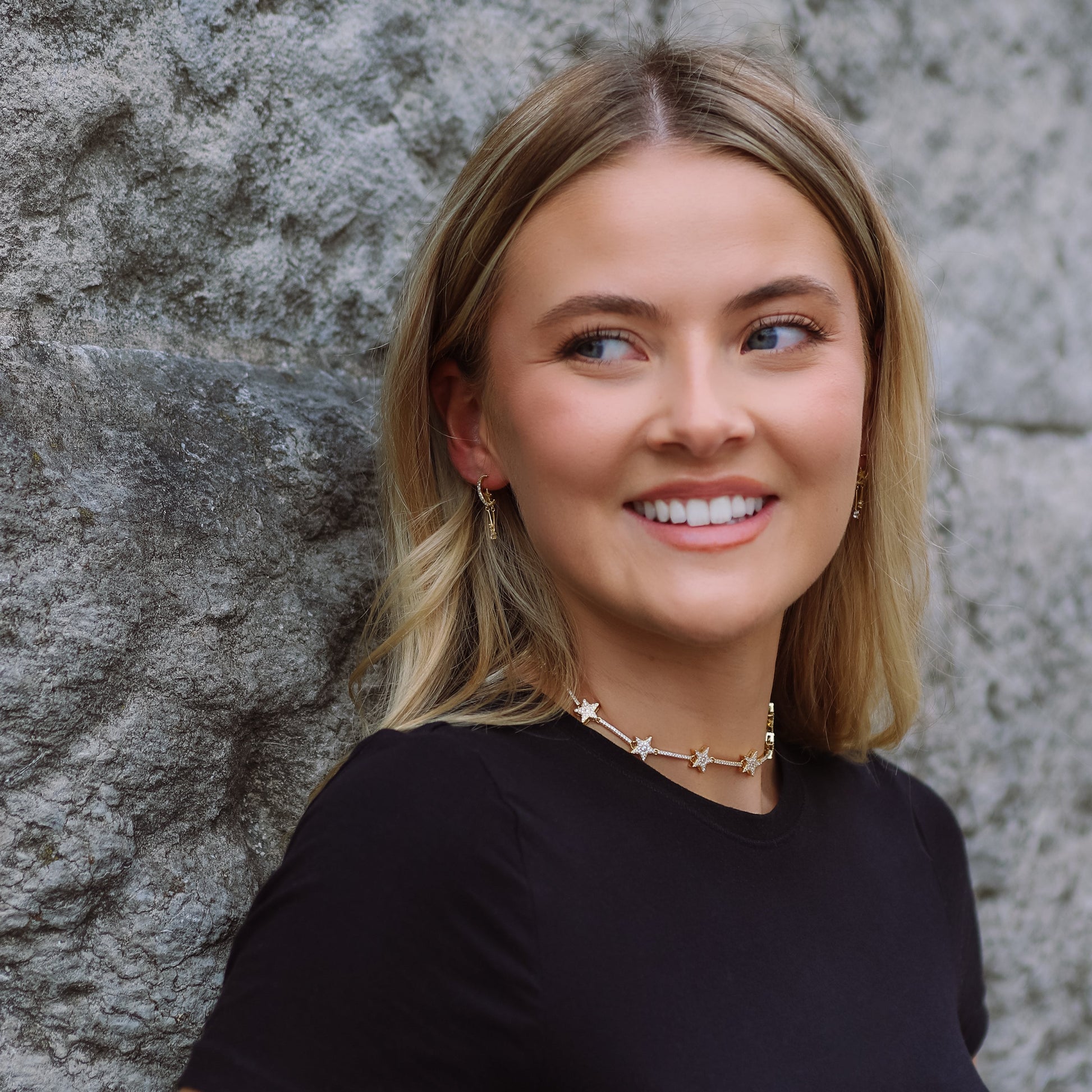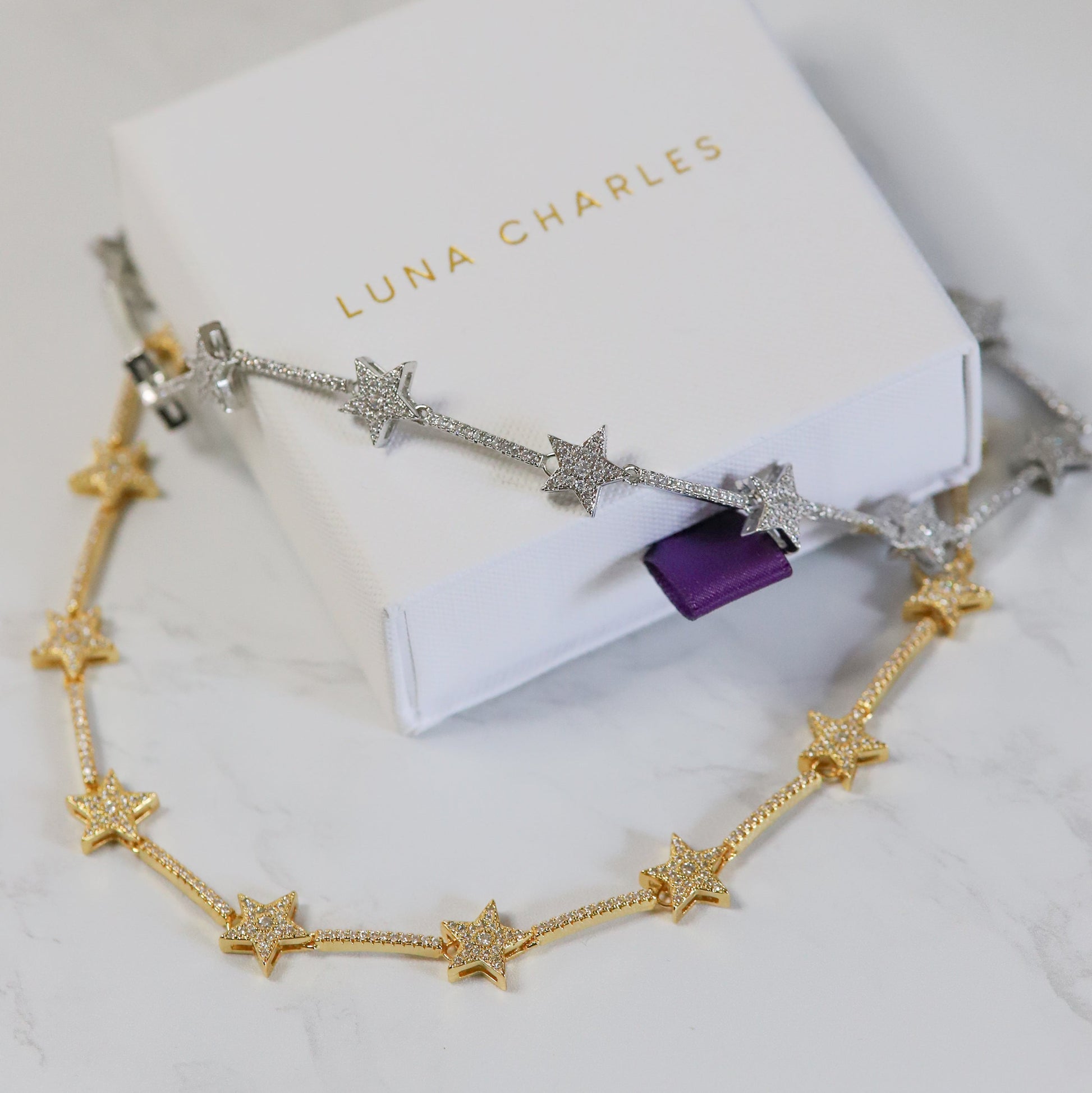 If you're looking to elevate your look to a whole new level, a whole new galaxy in fact then celestial inspired Margot is the necklace for you! She is an absolutely stunning choker necklace featuring chunky stars all the way around and completely adorned with sparkling pave crystals for an elegant glamorous look.