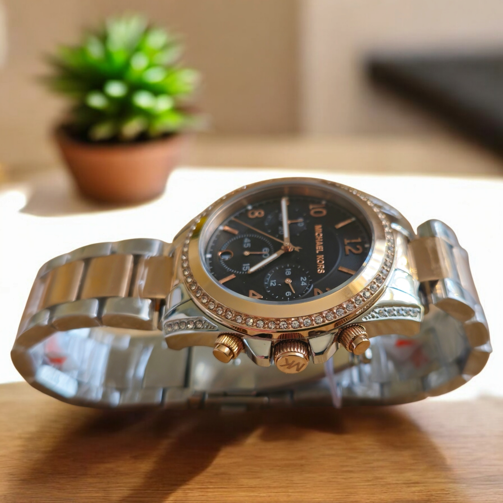Michael Kors® Ladies MK6093 S Blair Watch is an iconic piece in the Michael Kors collection featuring a stunning silver tone stainless steel case and multicolored silver/rose gold bracelet set accompanied by a deep black dial for a fashionable image. The 39mm dial showcases a detailed chronograph display and a date window, protected by durable mineral glass.
