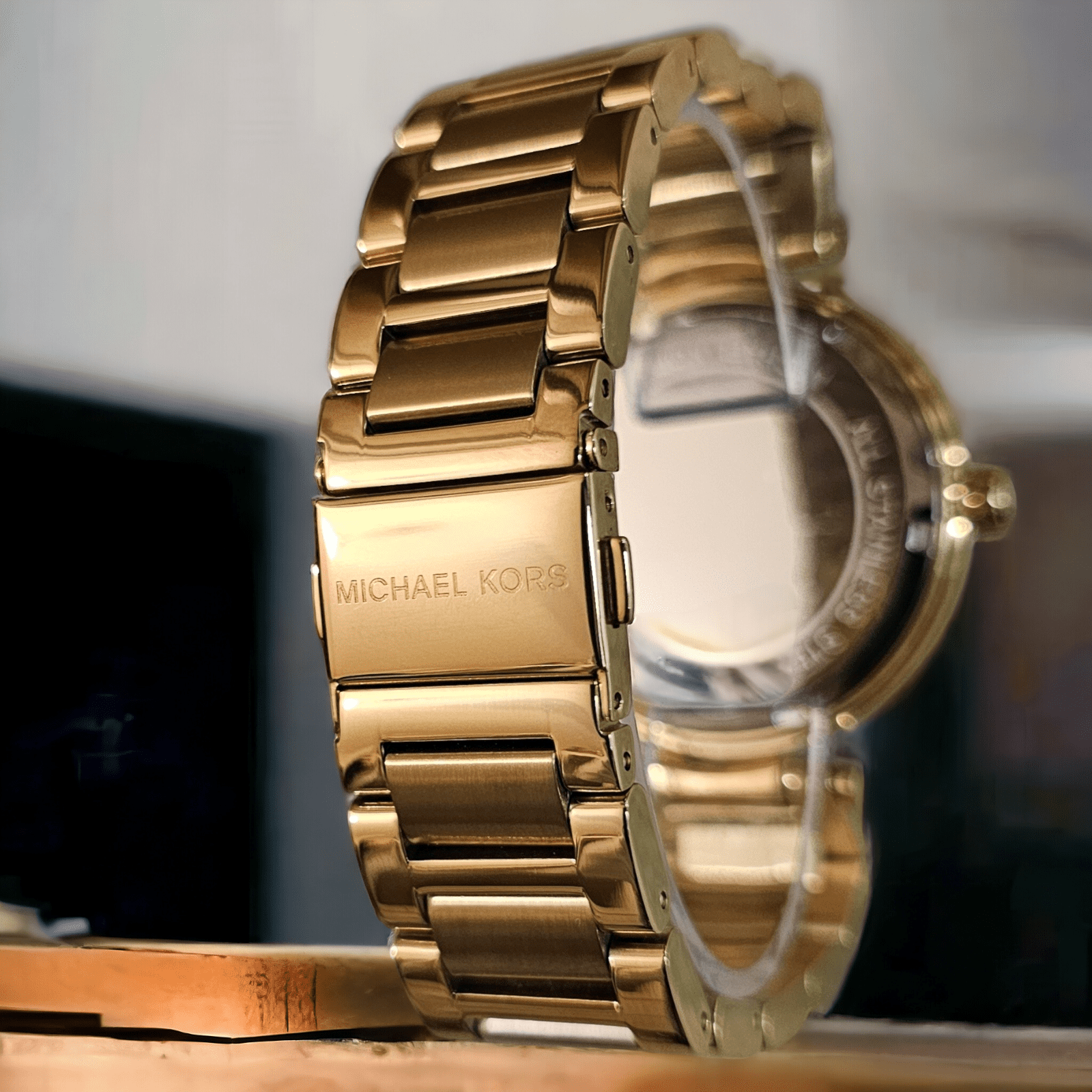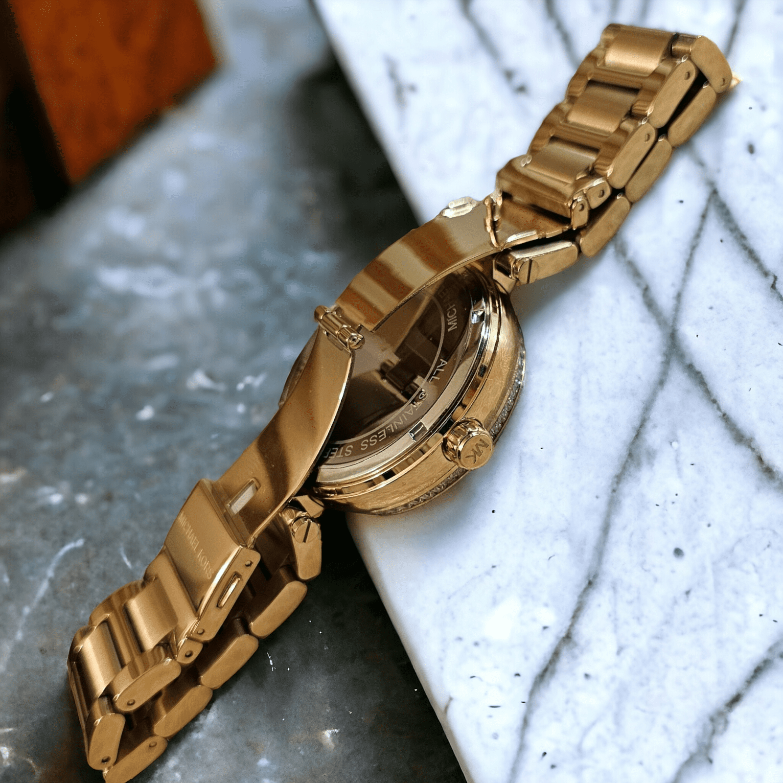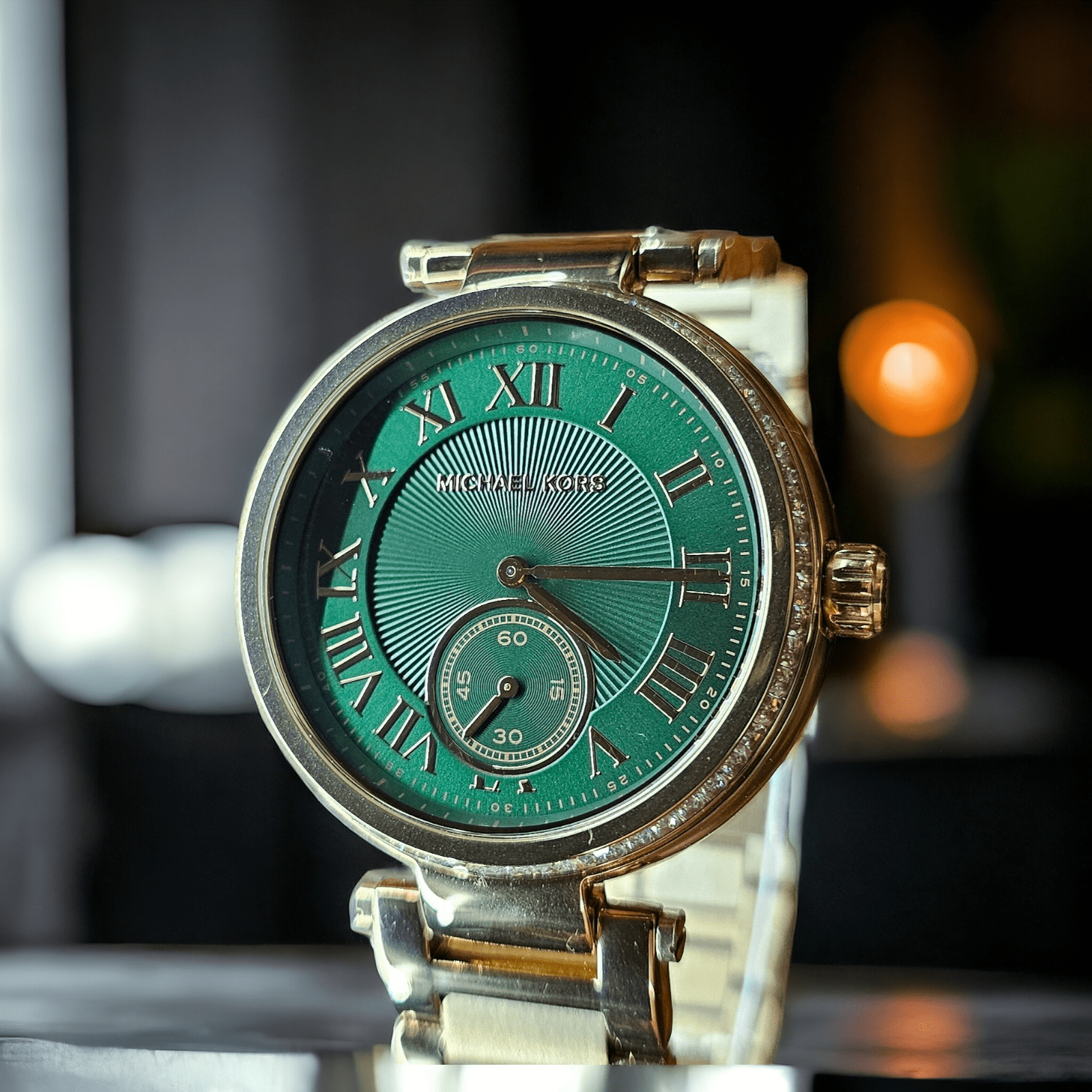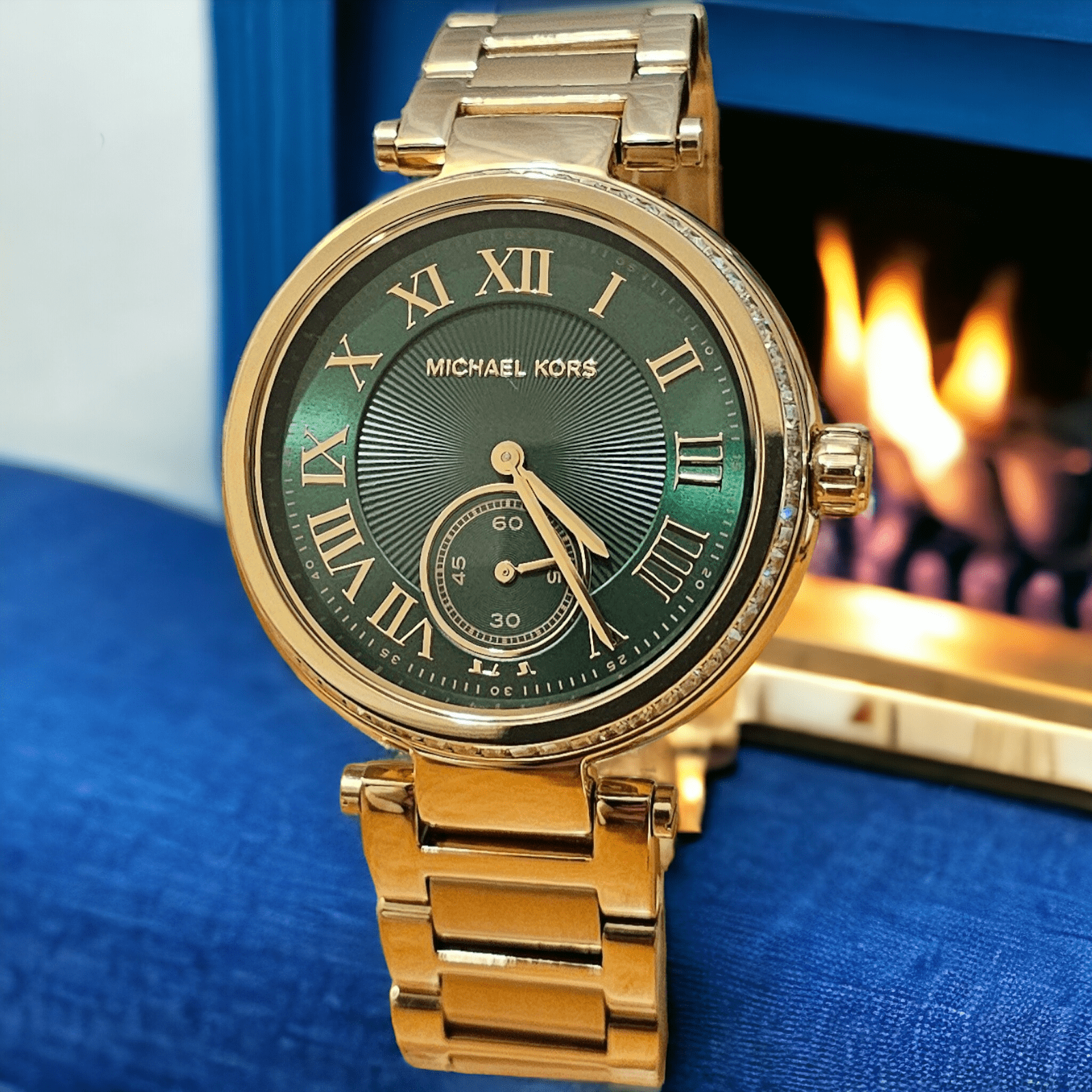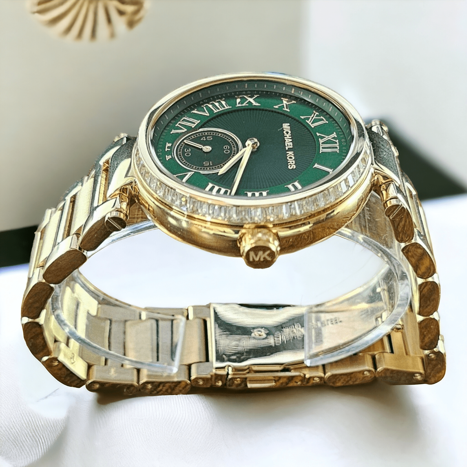 Michael Kors ladies MK6065 Skylar Watch is an iconic piece in the Michael Kors collection featuring a stunning gold tone stainless steel case and bracelet set accompanied by a deep green dial for a fashionable image. The watch also has baguette swarovski stones set on the bezel.