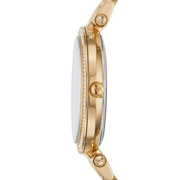 Michael Kors Darci MK4381 is a beautiful and eye-catching Ladies watch. A high quality of the item while the dial colour is Champagne. Gold-tone stainless steel case and bracelet. Fixed gold-tone bezel set with crystals. Gold dial with gold-tone hands and index hour markers.