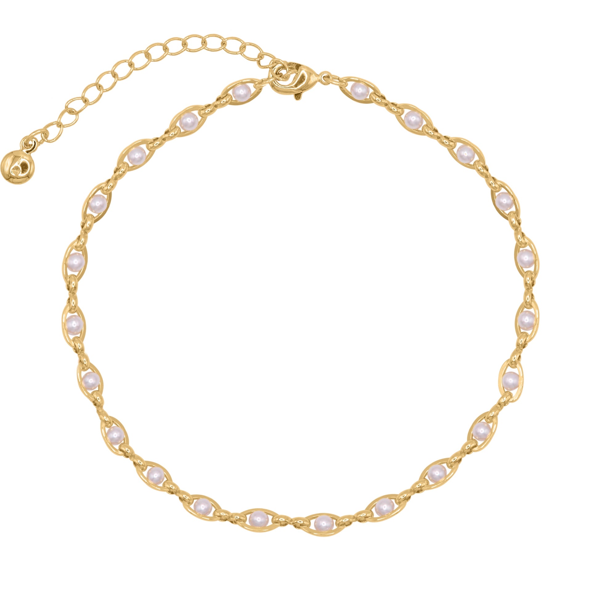 The Minnie Anklet is a delicate chain made up of oval shaped links with a tiny pearl inside each.