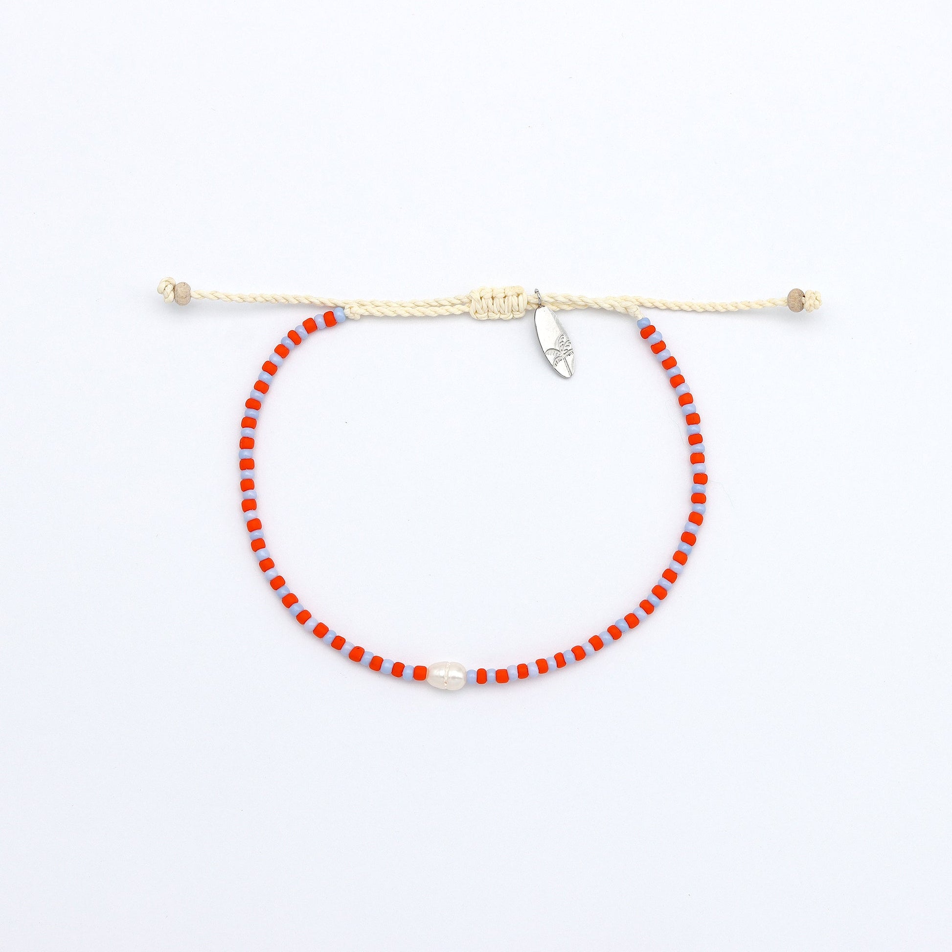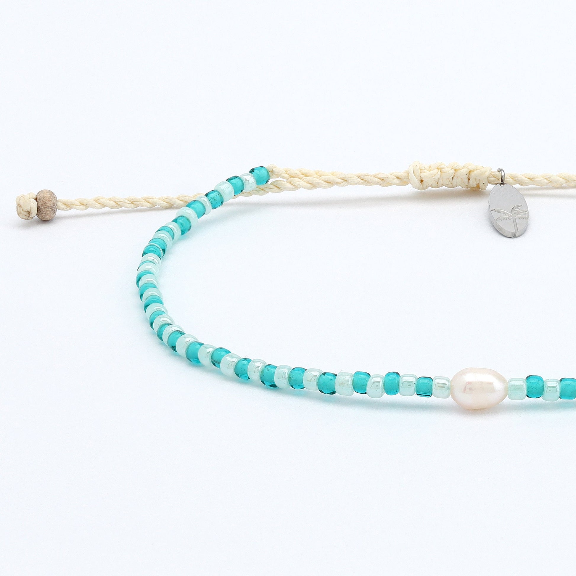 - Made with dainty colourful glass seed beads, centred with a real freshwater pearl, strung on our durable wax polyester and finished with our palm tree surfboard charm.