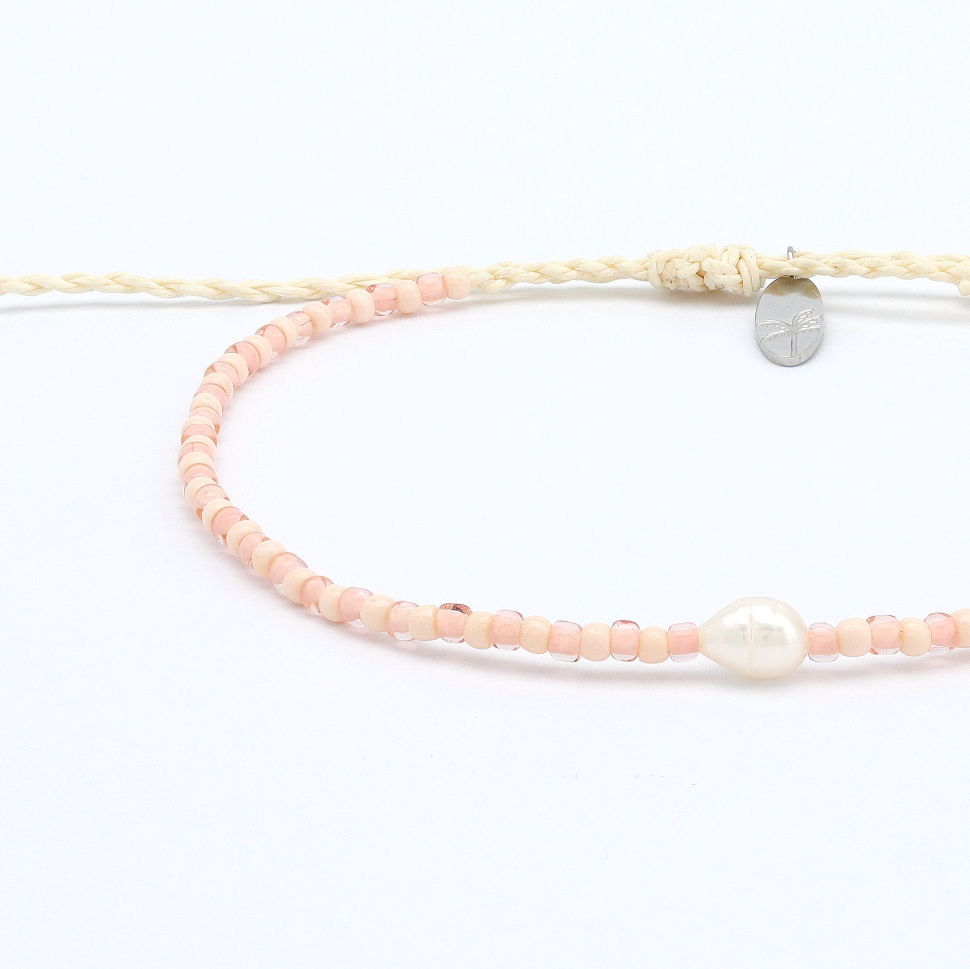 - Made with dainty colourful glass seed beads, centered with a real freshwater pearl, strung on our durable wax polyester and finished with our palm tree surfboard charm.