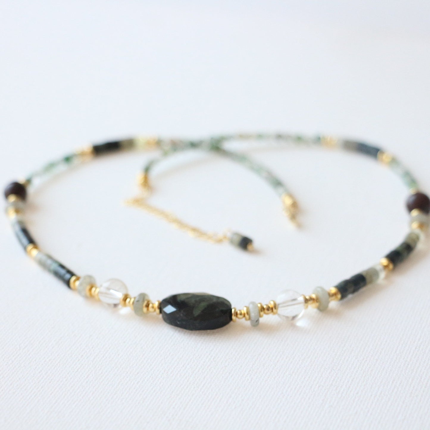 This colorful jewelry set by Jekira features a beautifully handcrafted necklace and bracelet made with natural Southeast Asian jasper (que zhai stone), white quartz, agate, and other complementary natural stones. Each piece is accented with 18K gold-plated copper findings, offering a luxurious finish with lasting shine.