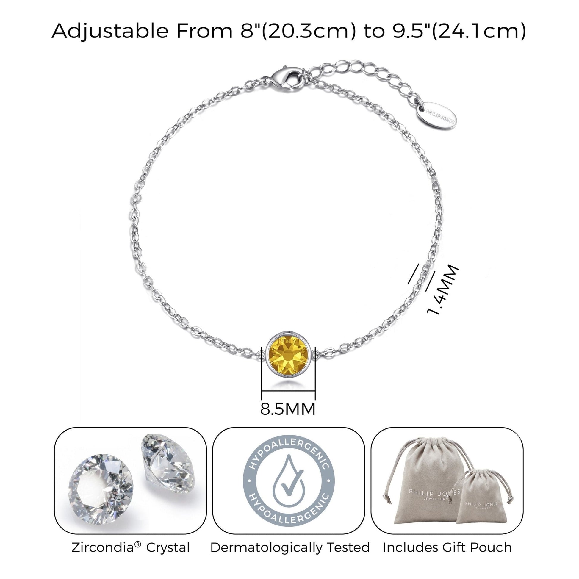 Enhance your look with this November (topaz) birthstone anklet. Crafted from silver plated brass alloy, this stunning charm anklet is finished with 20.3cm plus a 3.8cm extender cable chain and secure lobster claw closure. Featuring 1 8mm crystal from the renowned Zircondia® brand, the anklet comes in a stylish yellow hue.