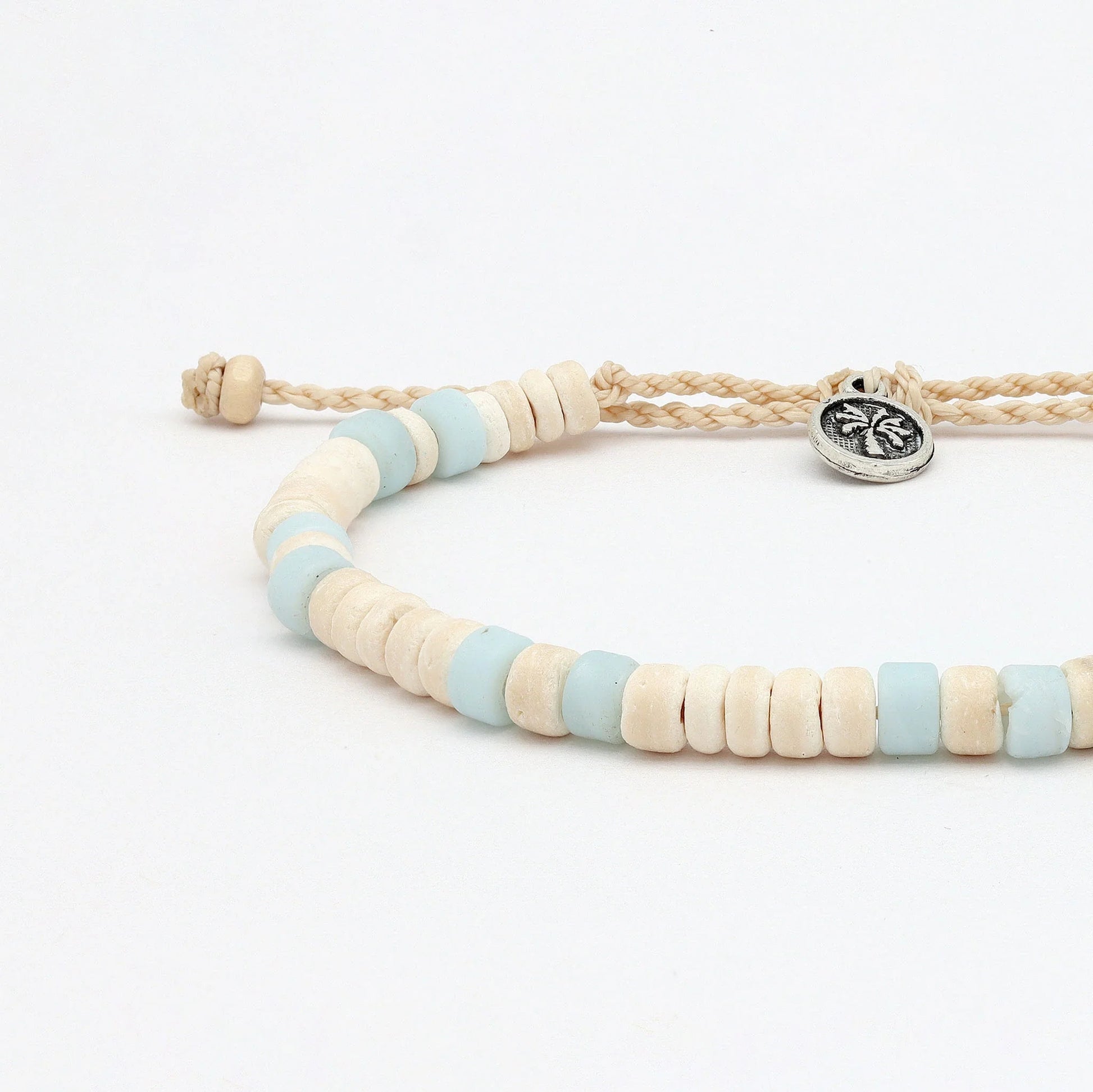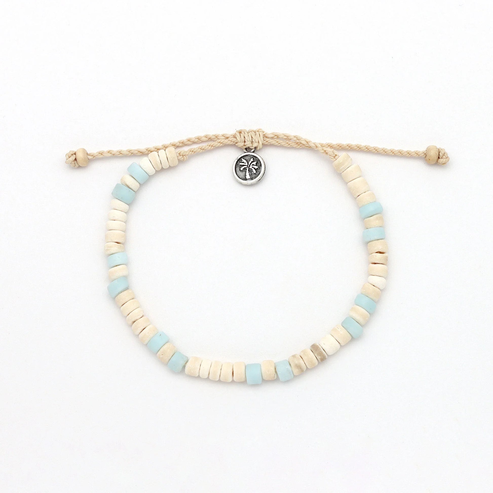 - Made with natural coconut wood, frosted glass beads and our durable wax polyester cord.
