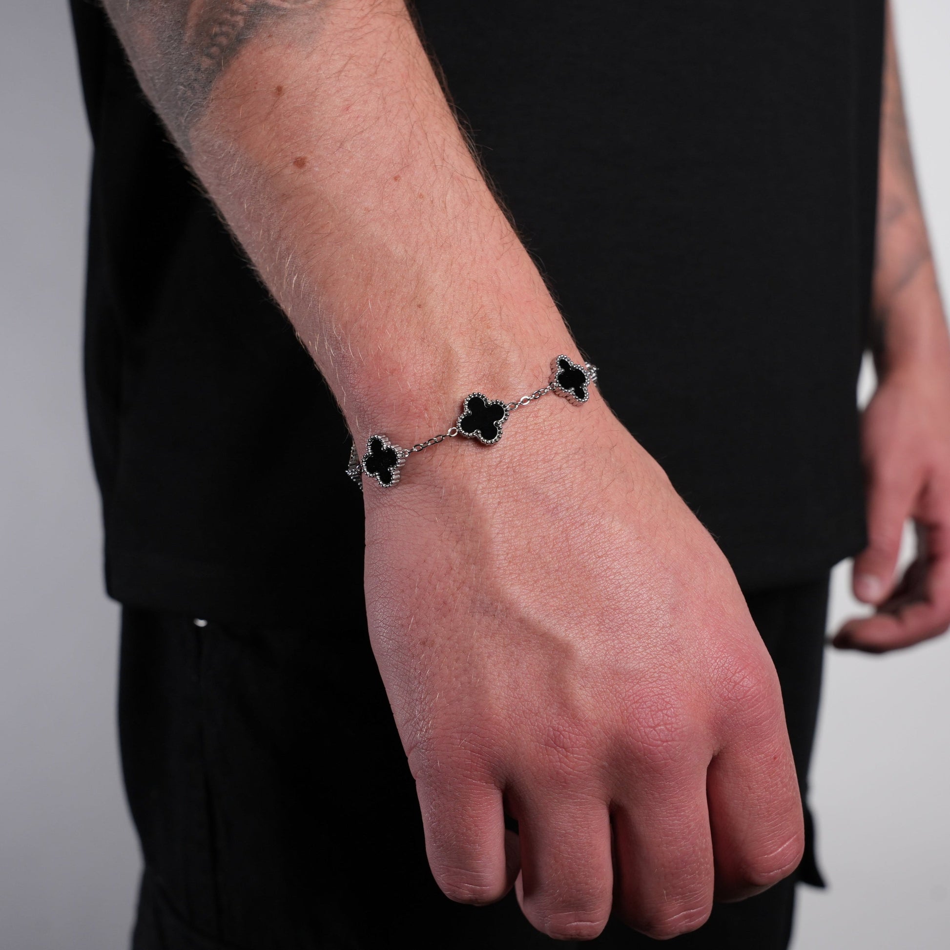 Unleash your inner style and confidence with our Clover Bracelet in sleek Silver and Black. Perfect for men who believe in making a bold statement, this bracelet features a unique clover design that exudes strength and luck. Elevate your look and attract positivity with this must-have accessory.