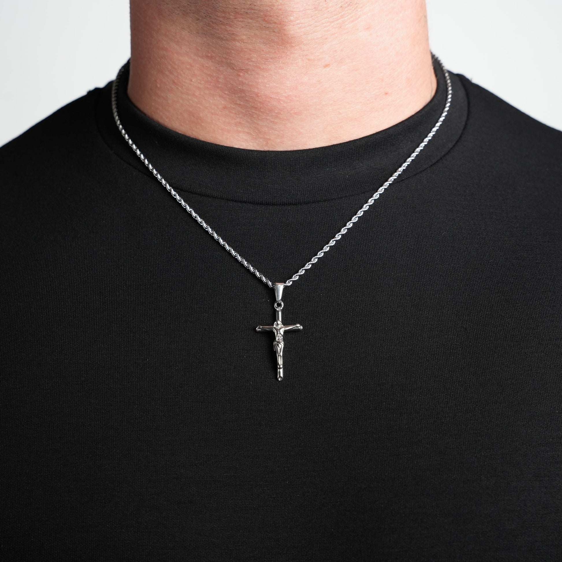 This delicate silver crucifix pendant features intricate detailing, making it a beautiful symbol of faith and devotion. Its elegant design adds a touch of grace and positivity to any outfit. Carry a reminder of your beliefs with you wherever you go with this stunning pendant.
