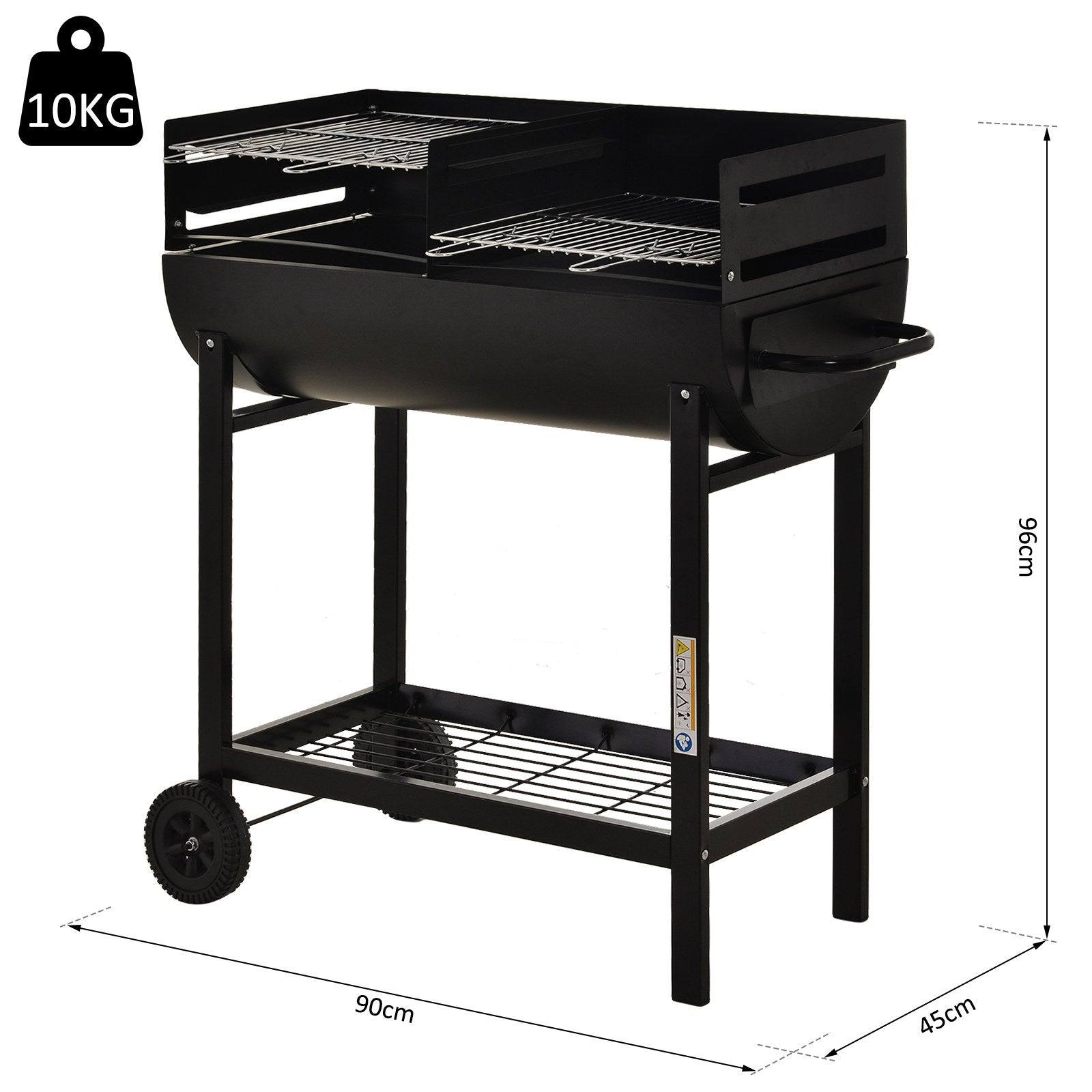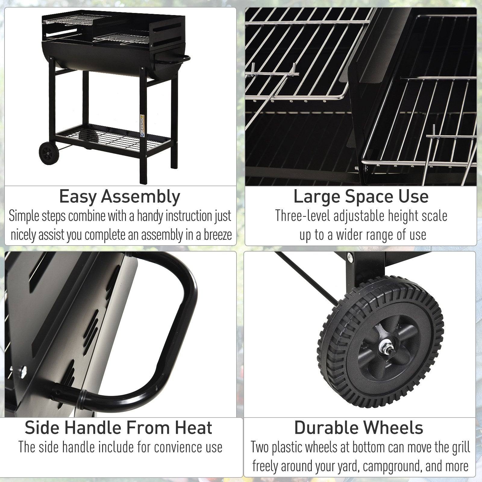 Take your outdoor parties and BBQs to another level with this charcoal smoking grill from Outsunny. Portable in design with two wheels for you to move around easily, it is made with two separate grilling areas, allowing you to cook more and halve your cooking time, with its 300? heat-resistant steel body allowing you to cook food to a high temperature and achieve a delicious smoked effect all your guests will enjoy. Adjustable to three different heights to set to a safe level whilst in use, this piece is finished with a bottom mesh shelf for convenient storage. An all-rounder which will deliver every time.