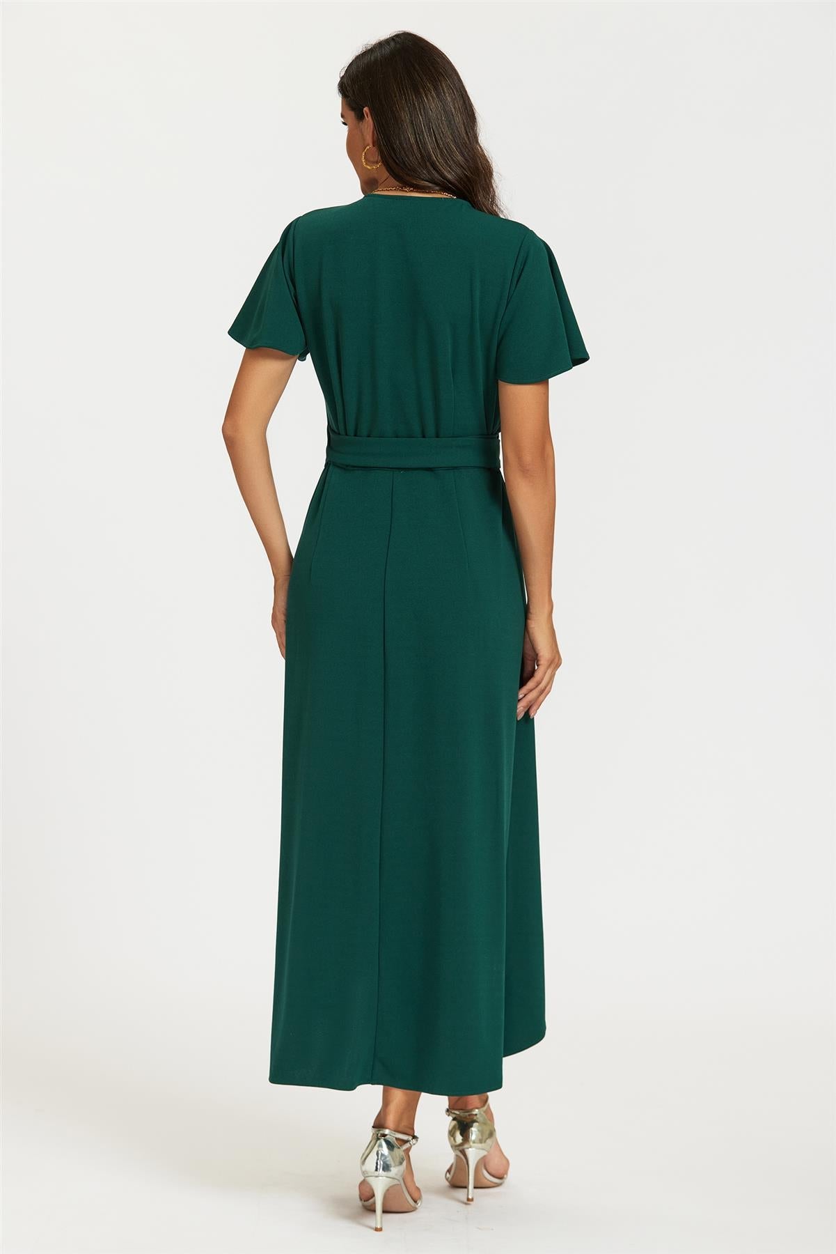 Timeless elegance meets effortless charm in this flattering emerald green wrap dress. Designed with a soft V-neckline and flutter sleeves, it cinches at the waist with a self-tie belt to enhance your silhouette. The wrap-front skirt creates a graceful tulip hem that moves beautifully with every step, making it perfect for both daytime occasions and evening events. Style it with strappy heels and minimal jewellery for a refined, feminine look.