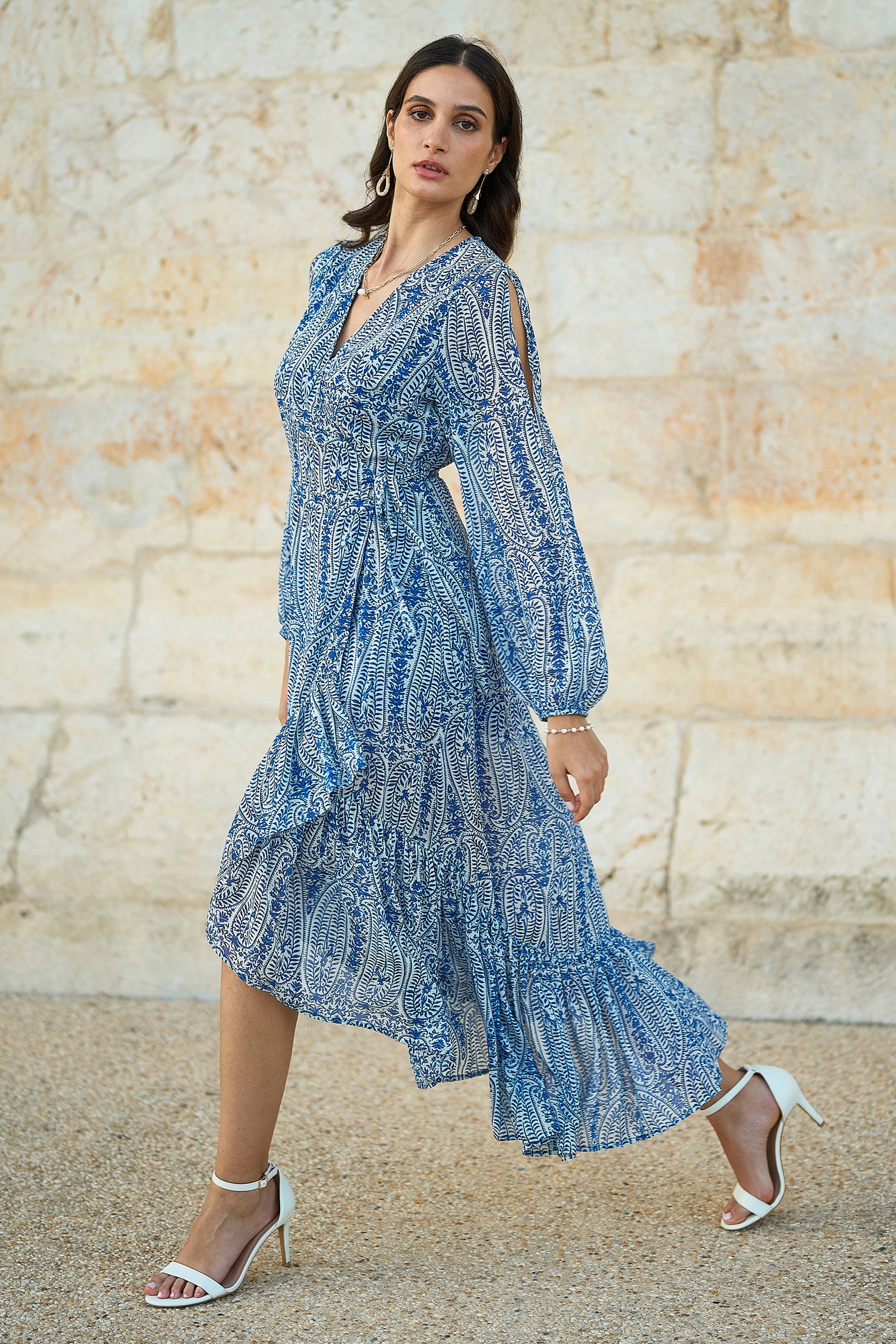 Yumi Blue Paisley Dipped Hemline Midi Dress With Open Long Sleeves