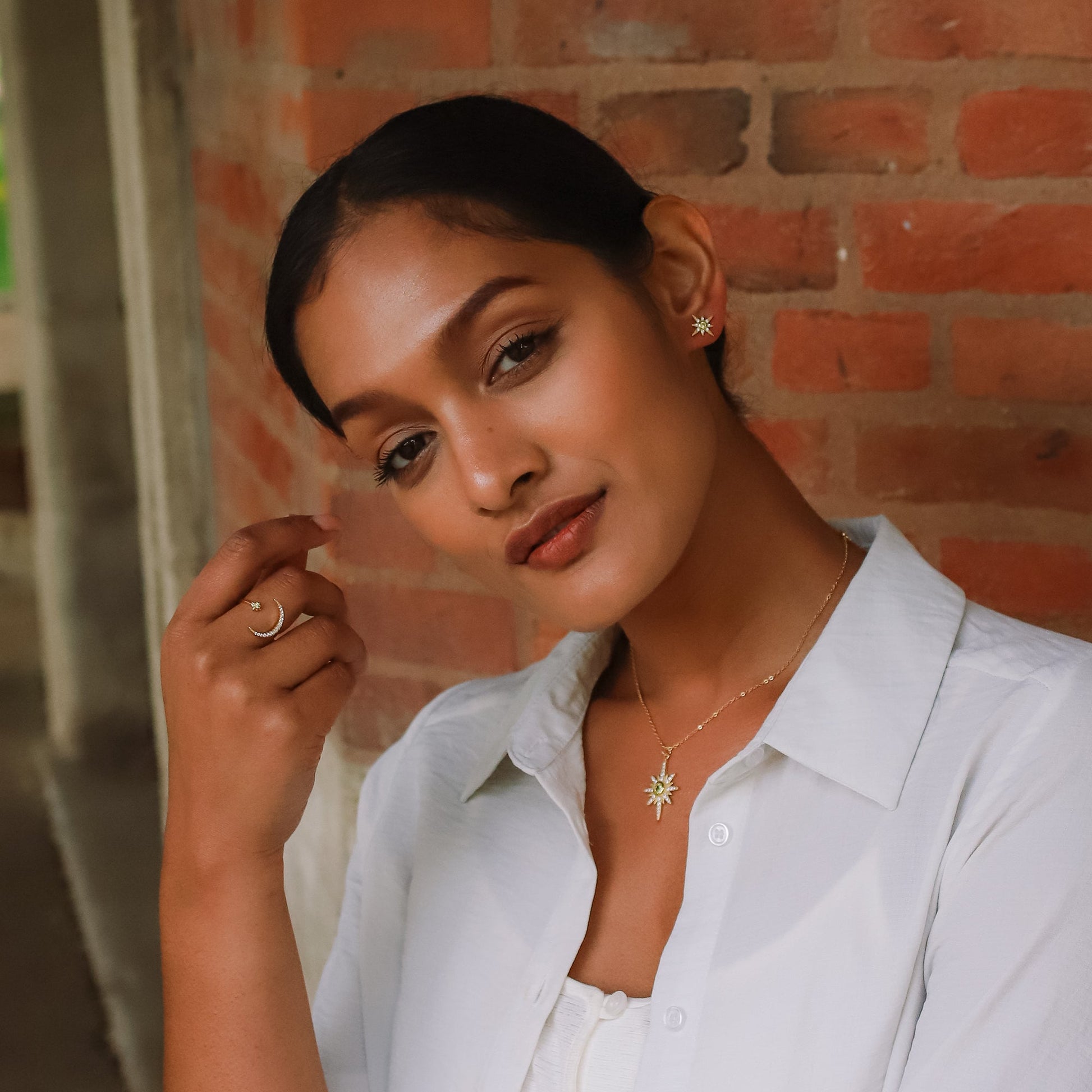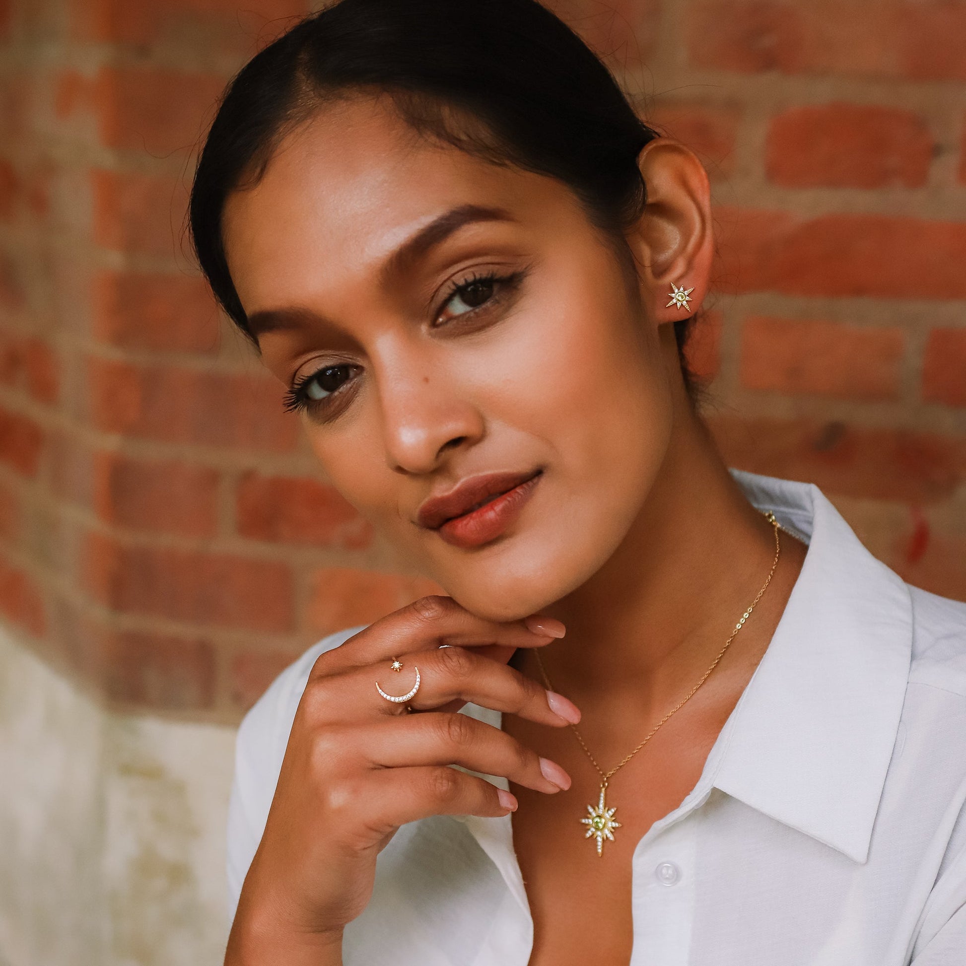 Our Zira Ring will make you starry eyed. A striking crescent moon is encrusted with pave crystals, sitting next to a small star set with your choice of birthstone.